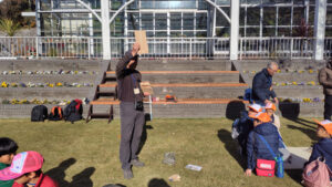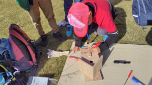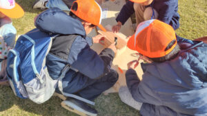 組みあがった巣箱を手にすがたに広場へ向かいます。